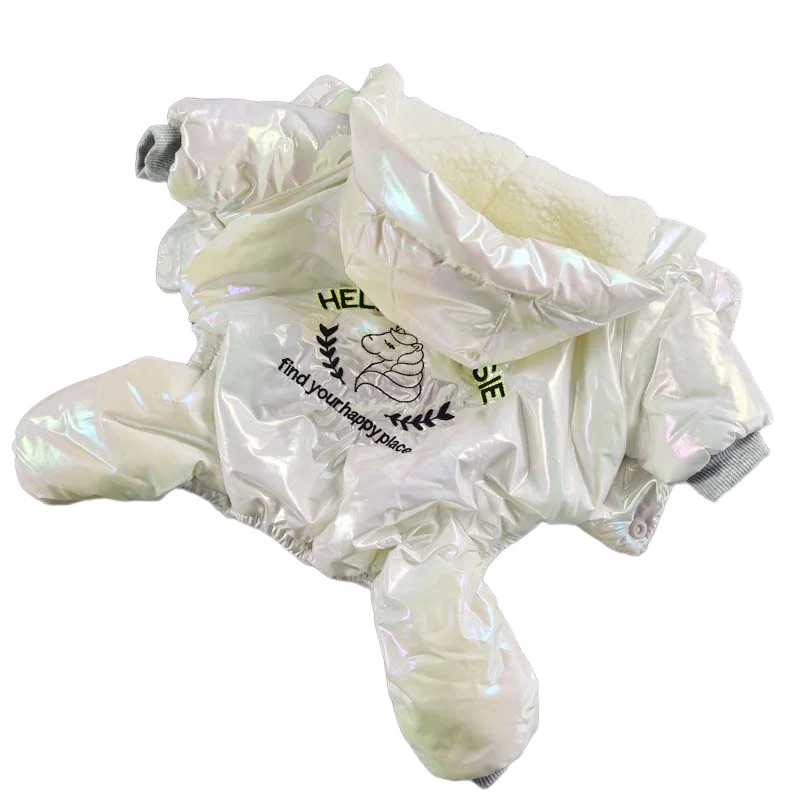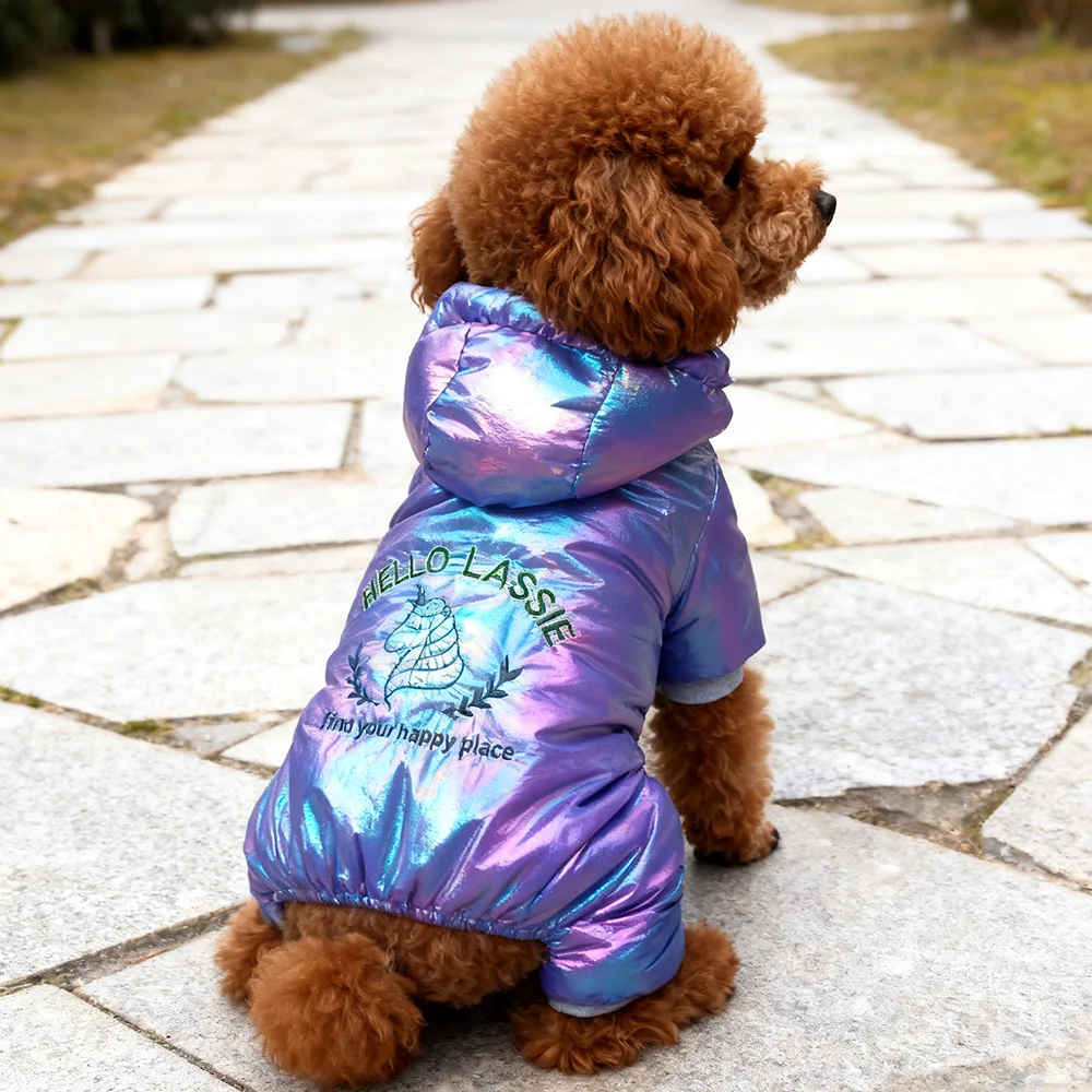המעיל עשוי פוליאסטר איכותי, עמיד למים וקל משקל, ומספק חימום מושלם גם בשלג ובמזג אוויר קר. הבגד כולל קפוצ’ון חמוד, עיצוב צבעוני ומבריק, שמוסיף סטייל לכל חיית מחמד, תוך שמירה על נוחות מקסימלית.