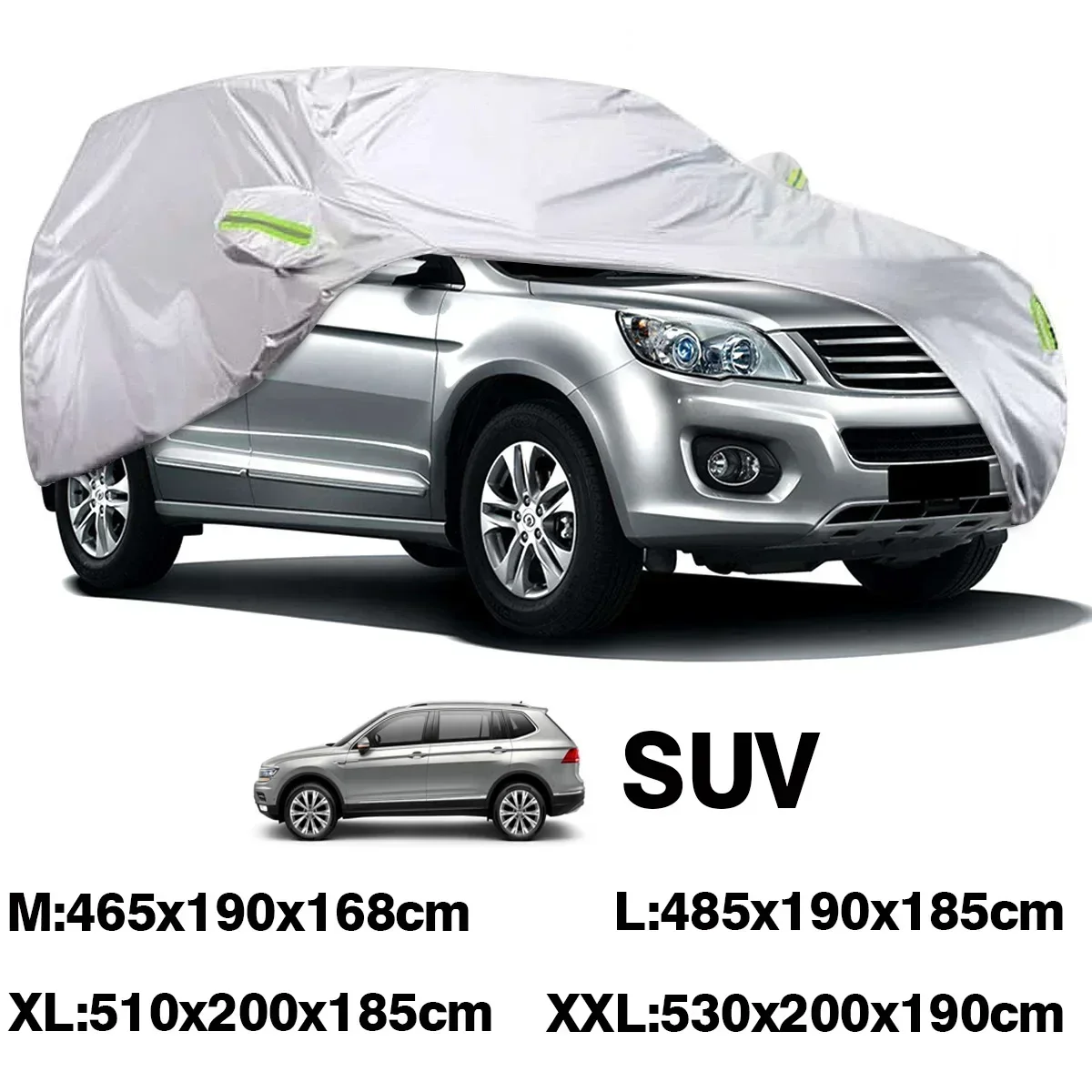 מכסי רכב אוניברסליים בגדלים M/L/XL/XXL לפנים ולחוץ, עמידים ברוח, אבק, קרני השמש, גשם ושלג, מכסה מלא לרכב SUV בצבע כסף
