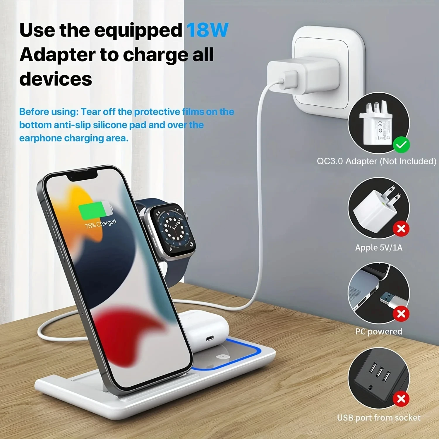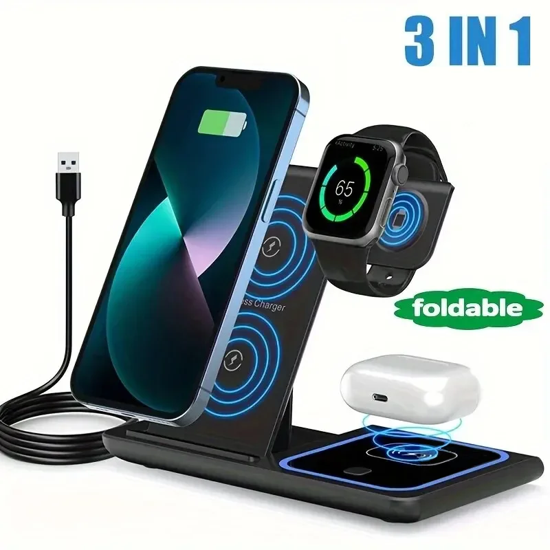מטען אלחוטי 3 ב-1 מתקפל עם תאורת LED – תחנת טעינה חכמה אחת לכל המכשירים שלך! ⚡️
