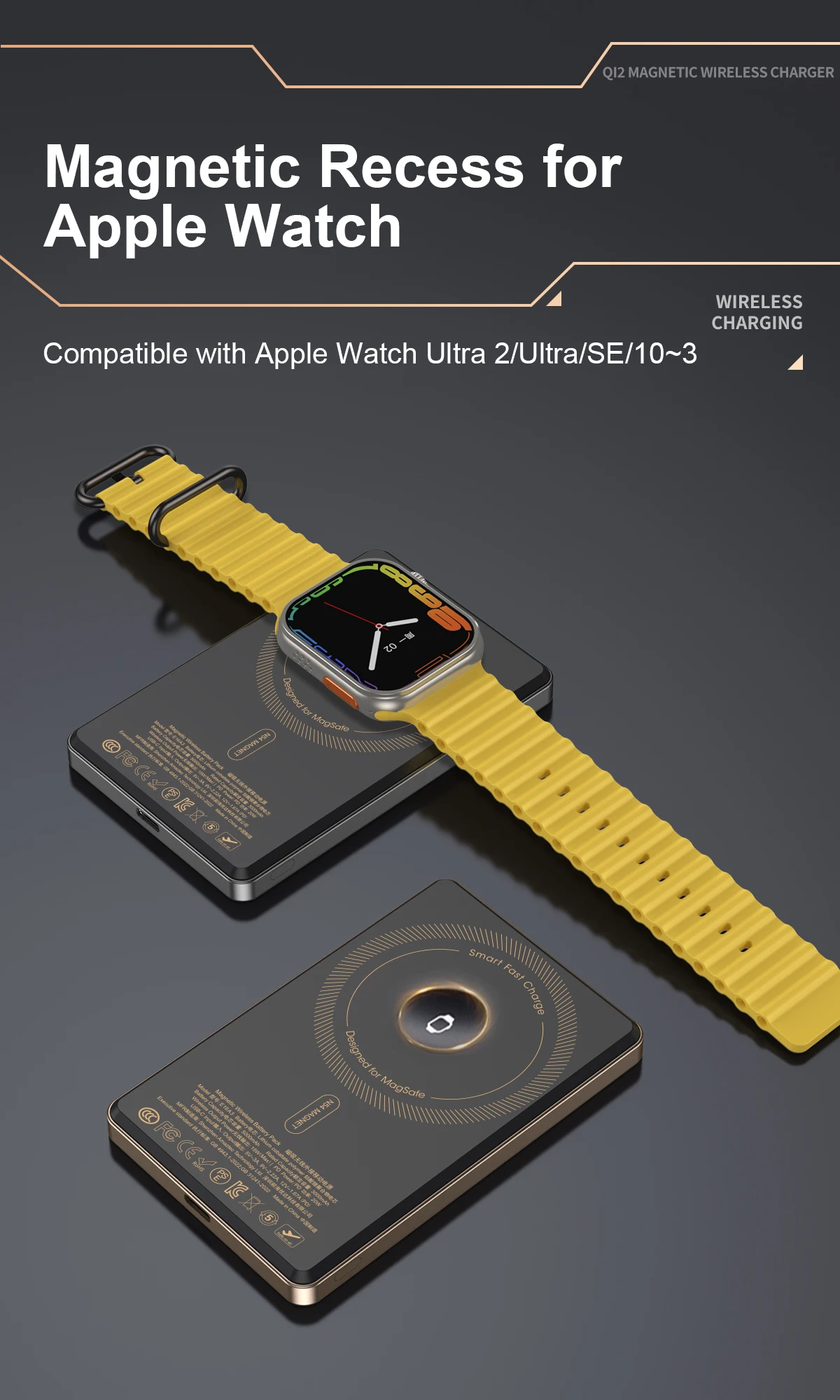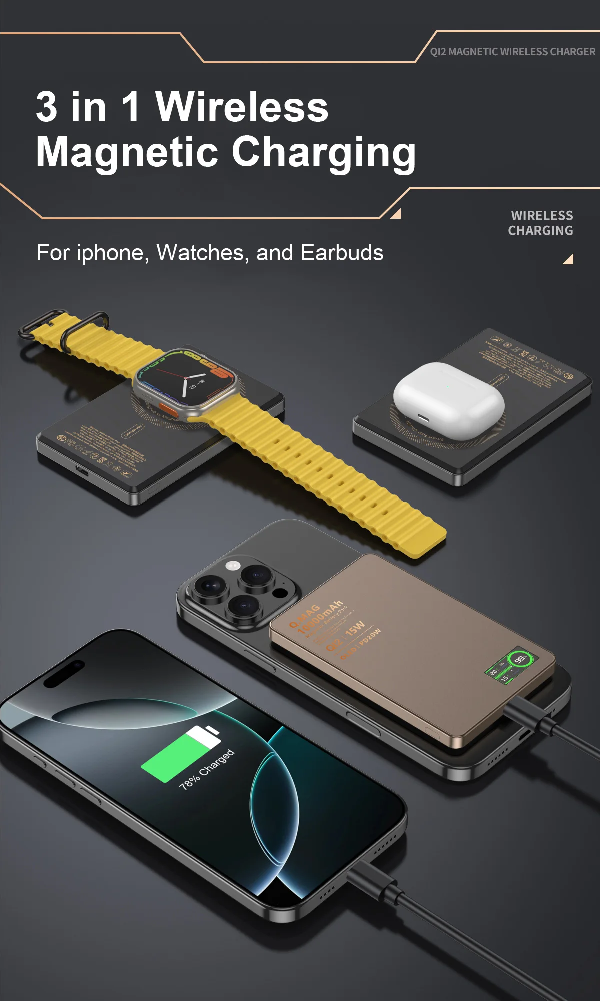 המטען מתאים ל-iPhone 12–16, Apple Watch (Ultra2/Ultra/SE/10–3), Airpods, וכן לתמיכה בטלפונים אחרים עם טעינה אלחוטית מגנטית כמו Huawei ו-Xiaomi.