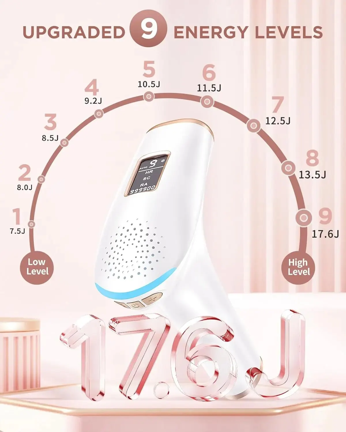 🔥 9 רמות אנרגיה מתכווננות – התאימו את עוצמת הטיפול לסוג העור שלכם ולרמת הרגישות האישית. ככל שרמת האנרגיה גבוהה יותר – כך התוצאה טובה יותר!