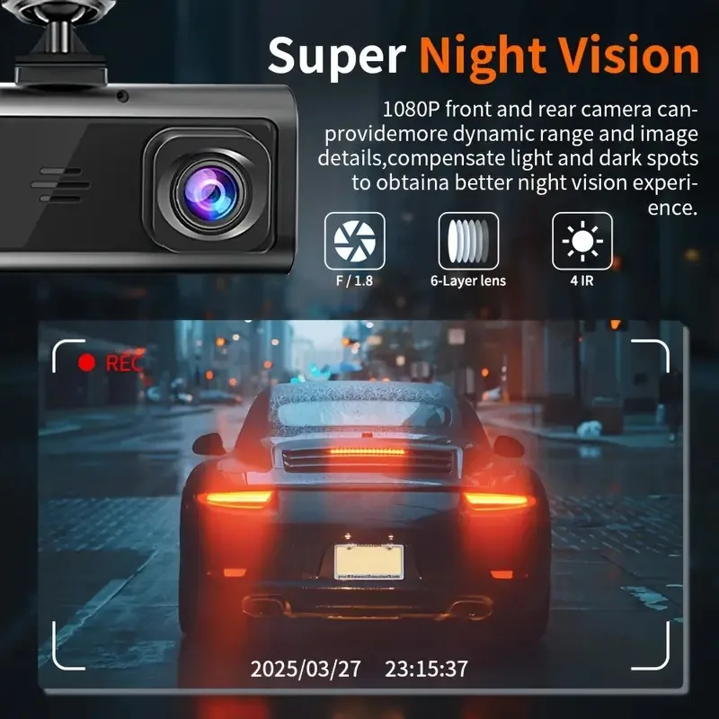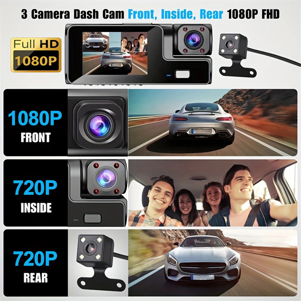 מצלמת רכב 3 ערוצים Full HD. מצלמת רכב זו כוללת קדמית, פנימית ואחורית ומאפשרת הקלטת כל נסיעה ברזולוציה גבוהה 1080P עם ראיית לילה WDR וחיישן G לזיהוי תאונות.
