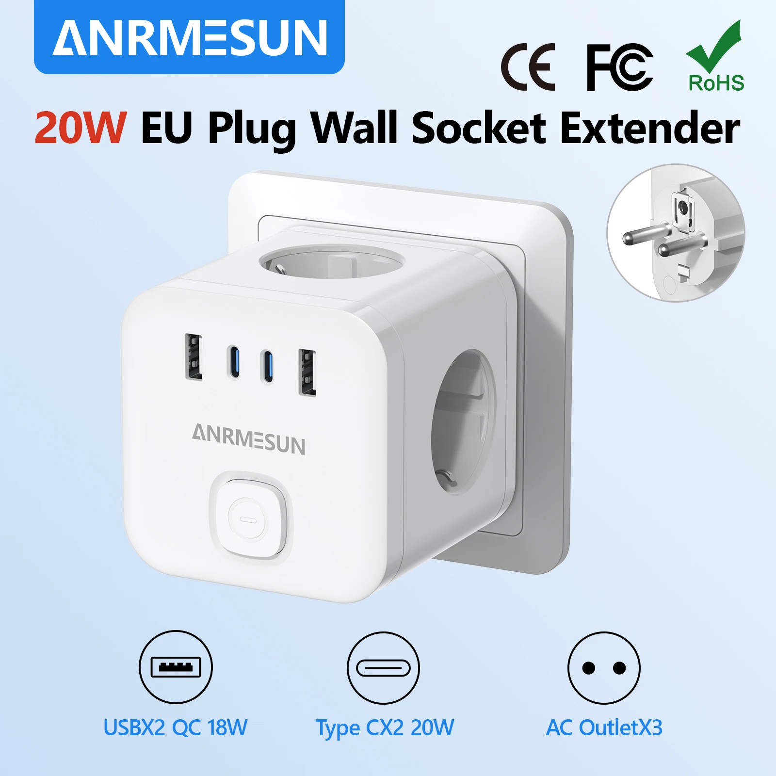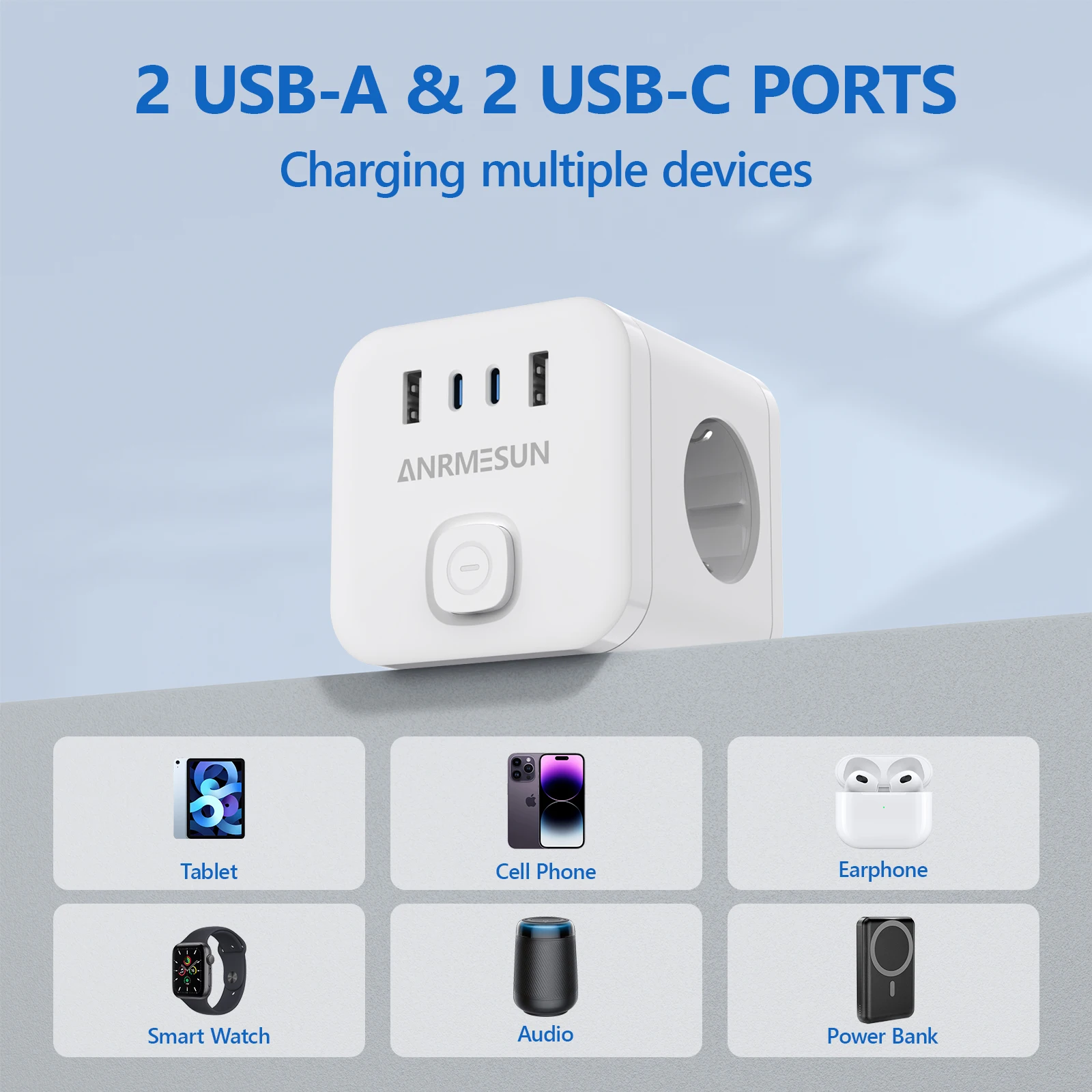 מתאם שקע קובייה 7-ב-1 עם USB ו-Type-C PD 20W – Anrmesun / JINGMIN