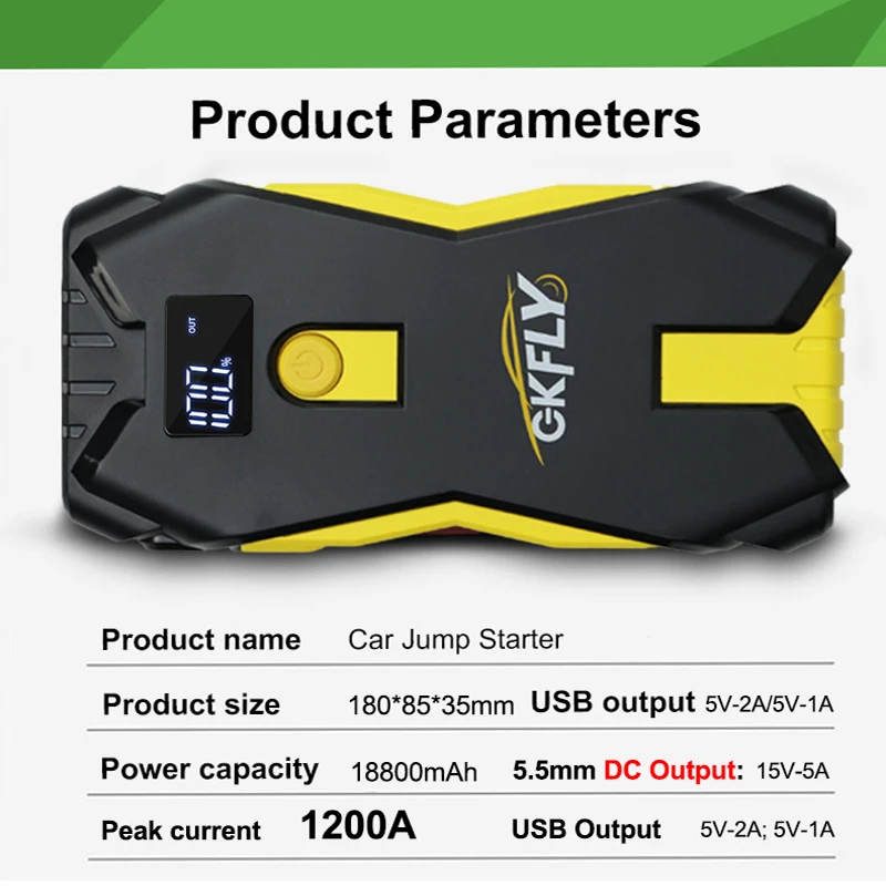 • GKFLY מתנע קפיצה לרכב נייד 12V בנזין דיזל כבלים ניידים סוללת בנק 1200A מטען סוללת רכב
