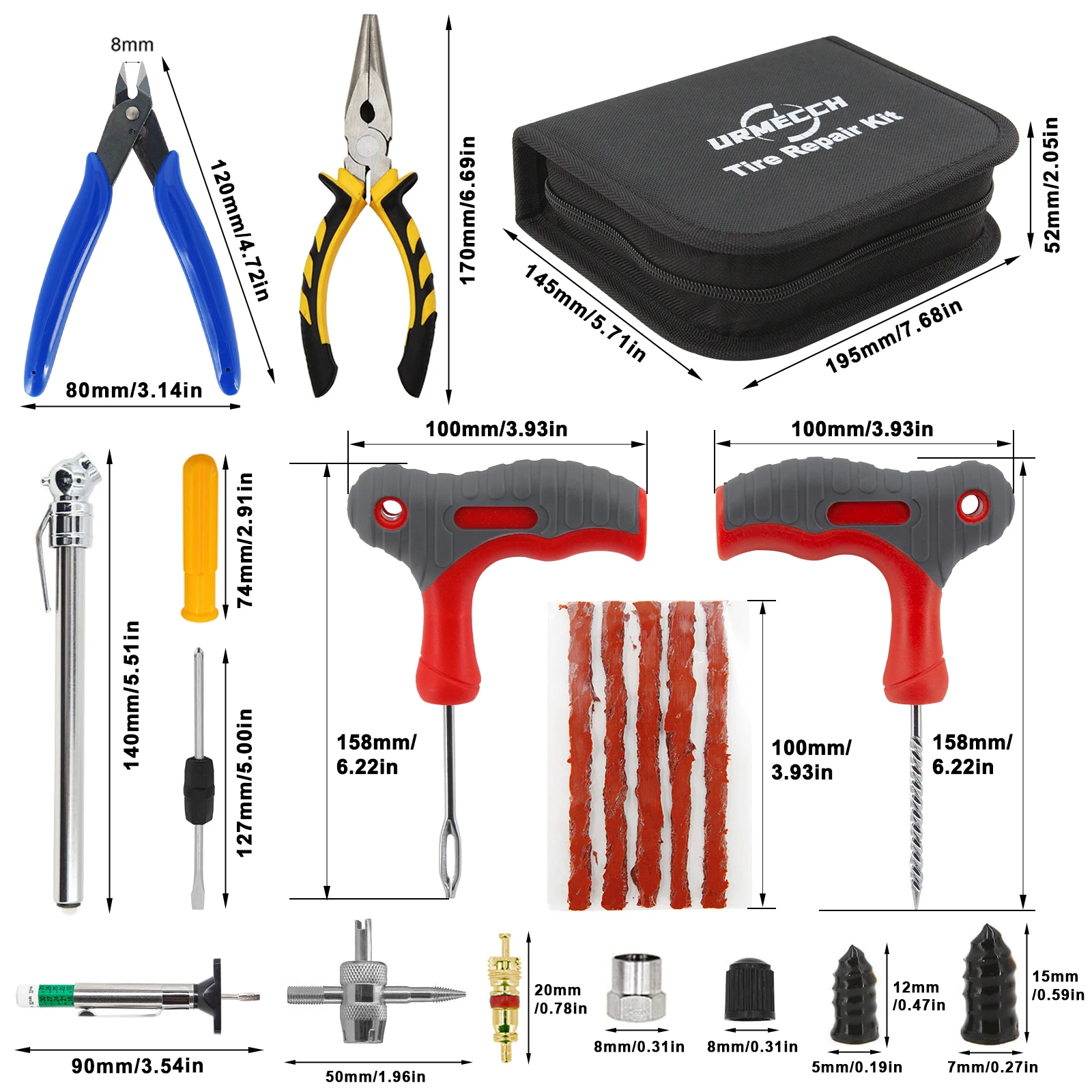 ערכת תיקון תקר לגלגלים בת 65 חלקים, מתאימה לרכב, אופנוע, טרקטורון, אופניים, טרקטורים, מכסחות דשא, קרוואנים ועוד. כוללת כלי עבודה חזקים ואיכותיים יחד עם אביזרים מתכלים – הכל בערכה קומפקטית וניידת אחת!