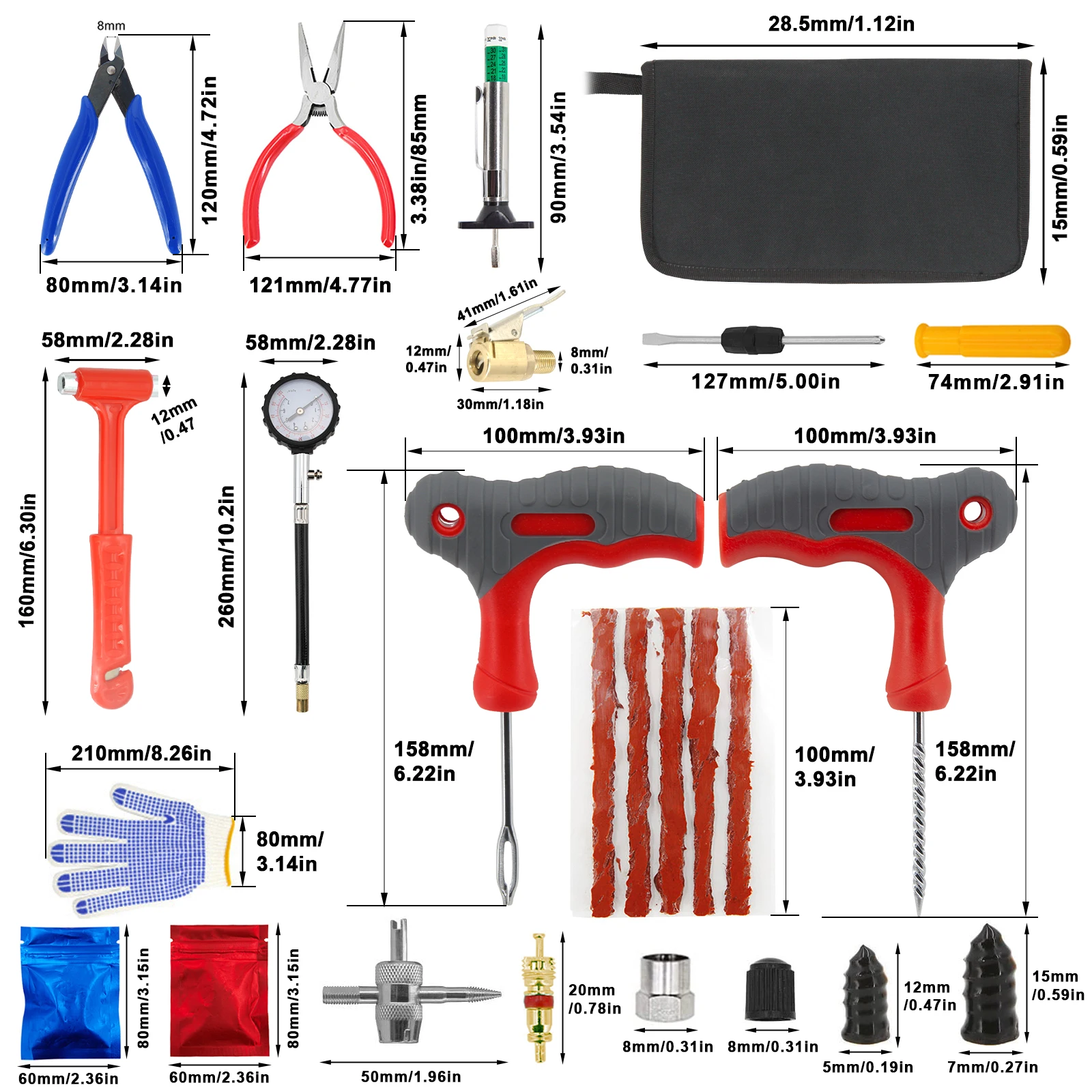 🔧 65 חלקים מקצועיים – כל מה שצריך לתיקון פנצ’ר מהיר בצמיגים של רכבים, אופנועים, טרקטורונים, רכבי שטח, קרוואנים ועוד.