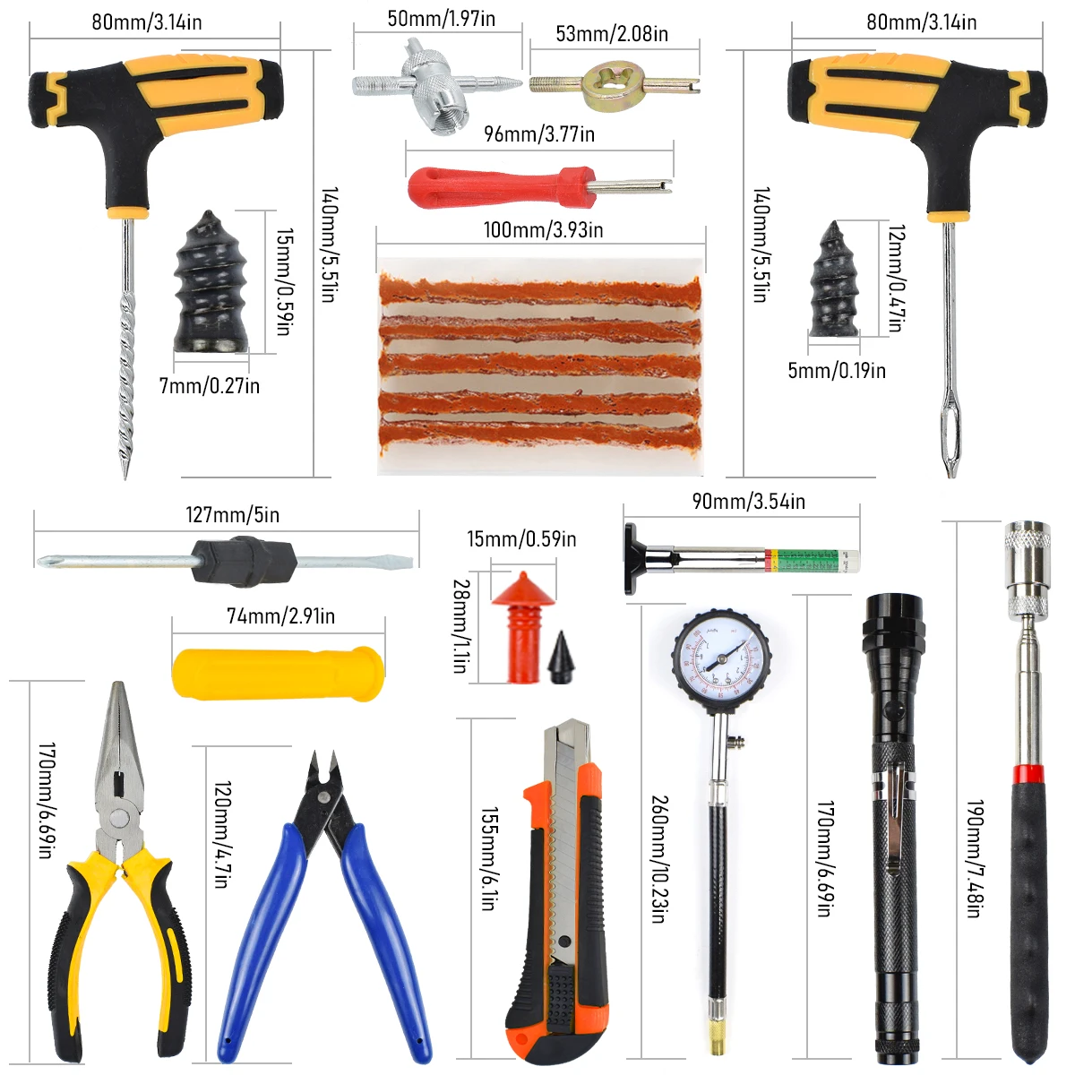 תיקון צמיגים ללא דבק: כולל סרט תיקון צמיגים וניתן להשתמש בו לתיקון חורים בצמיגים.