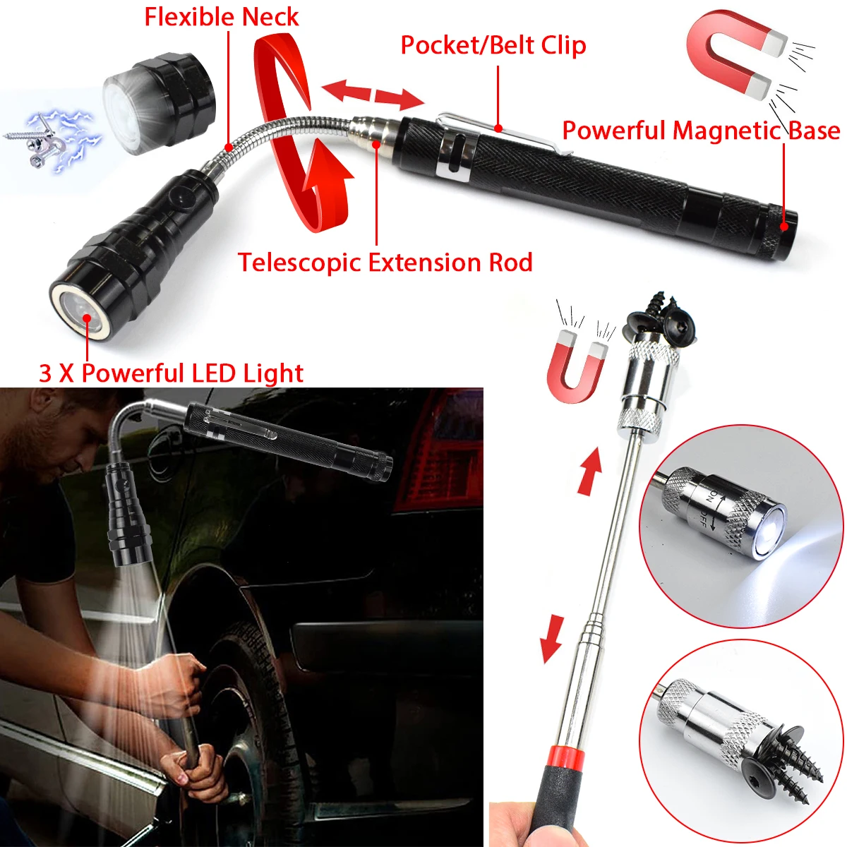 פנס מגנטי עם 3 נורות LED: מספק אור חזק למיקומים קשים וחשוכים.