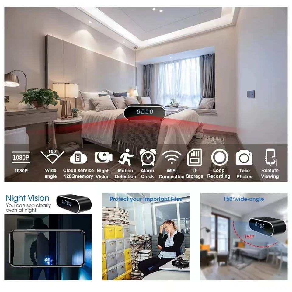 מצלמת השעון המיני מציעה פתרון דיסקרטי ויעיל לצפייה והקלטה, בעיצוב שמזכיר שעון רגיל. היא כוללת חיישן תמונה מתקדם, תומכת בהקלטת וידאו באיכות 1080P HD ולילה אינפרת ראיית אדום. המצלמה פועלת באמצעות Wi-Fi ומאפשרת צפייה והקלטה מרחוק מכל מקום בעולם, כך אפשר לעקוב אחרי מה שקורה בבית או במשרד שלך בכל זמן נתון.