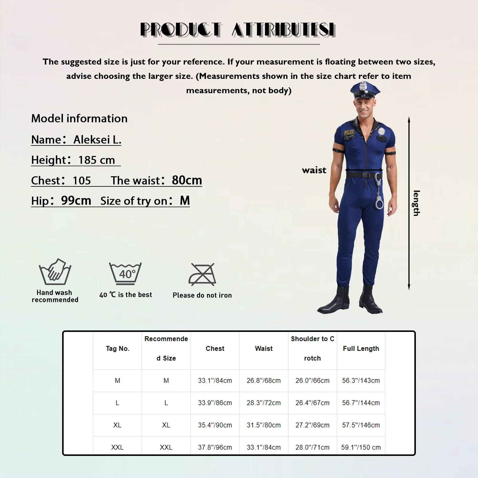 התחפושת עשויה מבד איכותי משולב פוליאסטר, ספנדקס ועור פטנט המעניקים מראה מבריק, גמישות ונוחות. הרוכסן הקדמי מאפשר ללבוש ולהוריד בקלות, והאביזרים משלימים את המראה של שוטר סקסי אמיתי.