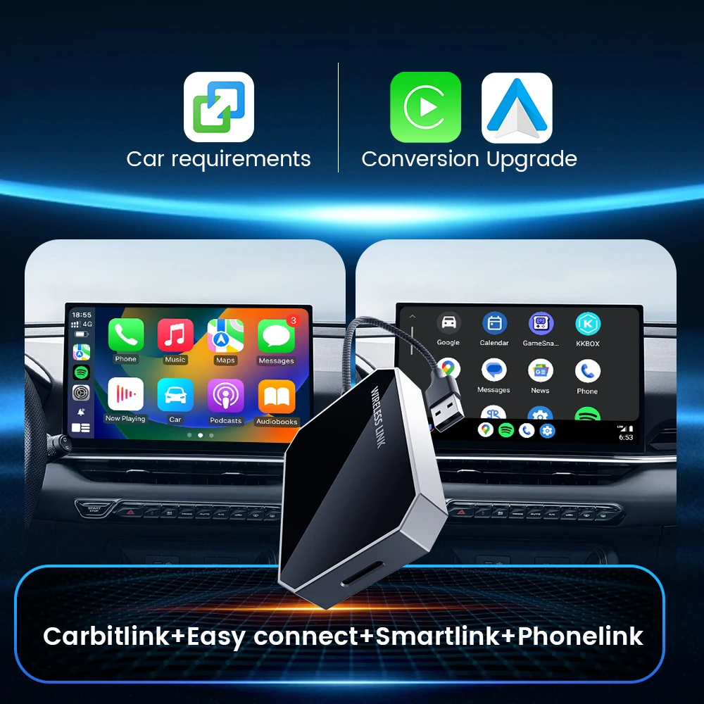 מערכת HEYINCAR Carbitlink Smartlink מאפשרת חיבור אלחוטי ל-CarPlay ול-Android Auto ברכב שלך בקלות ובמהירות. עם התקנה פשוטה Plug & Play, המכשיר תואם למגוון רכבים פופולריים כמו BAIC, Dongfeng, Changan, FAW Bestune, Forthing, GAC, Hongqi, Jetour, Geely, JAC, Kaiyi ועוד.